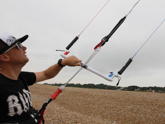 We had to consult the Nobile website to work out what the strange graphic was on the kite, even now we’re not sure how you pronounce it! Koinobori is a new addition to the traditional T5 name and it refers to the team of aerodynamic engineers that they teamed up with to come up with the all new T5 kite. This year it has undergone some major surgery and the result is a new outline, arc and profile that combine to make the kite even better than it has been in previous years. They’ve even tweaked things like the thickness of the bridles and the flying lines to enable the kite to fly faster! As usual the construction is top notch, it is interesting to see that while some smaller brands are obviously using the same factory, Nobile is remaining ahead of the pack and the attention to detail and quality delivered in the manufacture of this kite is up there with the major brands. Plenty of stitching, segments and reinforcements adorn the canopy and this should ensure your kite lasts a good few seasons. The bar supplied is the new KISS bar which stands for Kite Intelligent Safety System, the chicken loop is really polished and one of the simplest to reconnect that we have come across. It releases easily under load and features a pull pull webbing trim system above the bar and a movable stopper ball. Overall the 4-line set up is really simple and feels good in the hands.