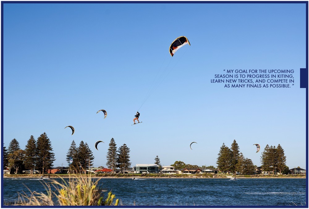 My goal for the upcoming season is to progress in kiting, learn new tricks, and compete in as many finals as possible. To achieve this goal, I spend as many hours on the water as possible to improve while working on my off-water activities.