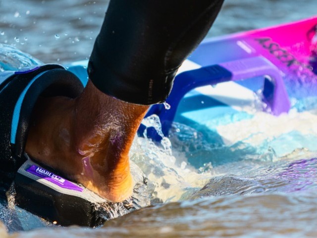 The construction of the Ascent is carefully balanced, utilizing a custom blend of carbon and glass fiber. This combination ensures stiffness in the center of the board, which contributes to solid landings and an explosive response upon take-off. In contrast, the tips are designed to be softer, offering smooth landings that are forgiving on the knees, thus promoting longer sessions on the water without discomfort.