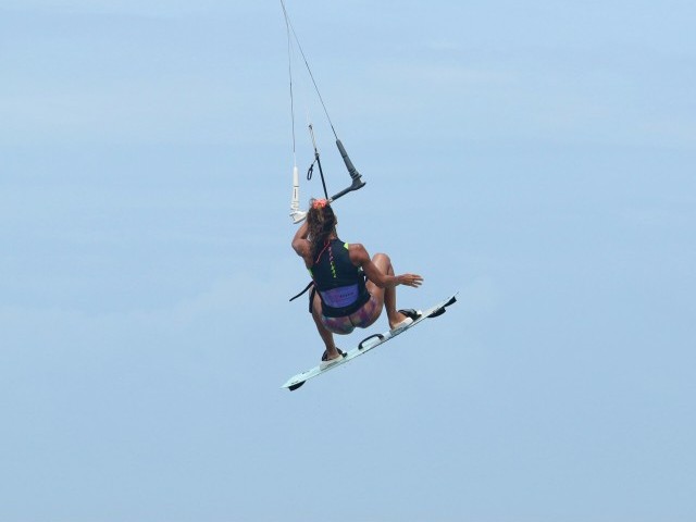 It’s all about rotating slowly, to give you plenty of time for the grab. This means less carve and less head. By keeping your rear leg stiff, you’ll avoid carving up, but by feathering the bar out, you will naturally turn up a tad further. From here, you can fully extend, kicking yourself up and off the water, turning your torso as you do. Once you’re extending, you can pull the bar in for extra lift. All your effort should be in the up rather than around. Looking at Karine, you can see that she is taking off whilst still looking over the bar and at the camera:) This guarantees that she’ll rotate slowly. Her bar is pretty level, and her kite is hanging just past 12, giving her both lift and float.
