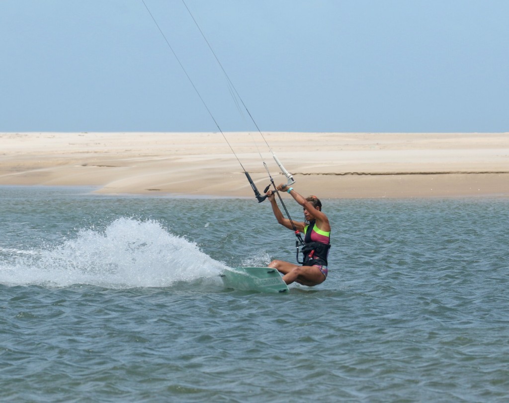 Once you can see where you are and judge where you’ll land, dive your kite. As the kite comes over 12, it will lift and hold you for a soft landing. Look slightly downwind towards where you’ll land and drop the board underneath you, ready for touchdown. Karine is looking where she’ll land, her kite is diving, and she’s twisting her hips to point the board into the wind.