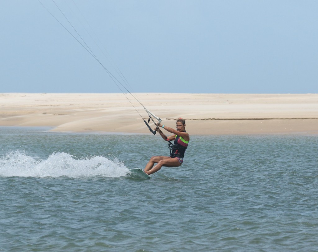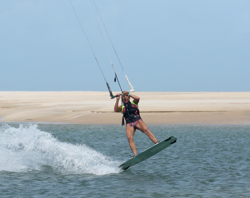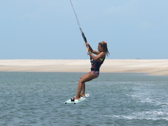 At the end of your send and whilst you’re still edging. It’s imperative that you do this before take-off. If you do, the kite won’t move back any further, and you already know where it is before getting airborne. The result is that there is no need to multitask as the kite is already sorted. You can rather concentrate all your efforts on the grab. You can see that Karine has levelled her bar to stop the kite; she’s still edging, her back leg is still stiff, so all her edge is in the water and she’s heading upwind, not carving up.