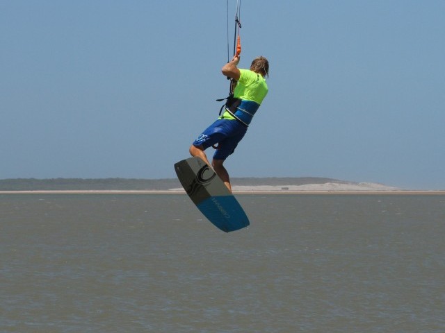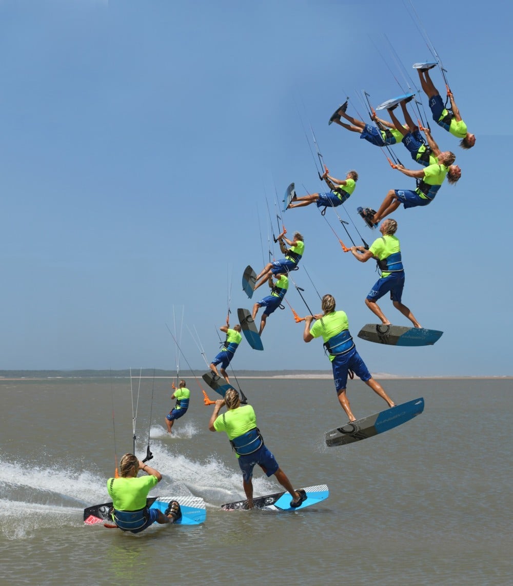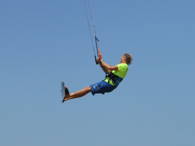 Here’s one from the dark ages, bringing back memories of two line kites, wrist leashes, long twin tips and even longer swims. The Stiffy is an inverted jump, but compared to today’s boner here both legs are used to push the board up high, kicking the lines with your toe side edge. To really claim it and make it more stylish you can get your head right back so that your body and legs are in line. In short, it’s a Dead Man without letting go of the bar.