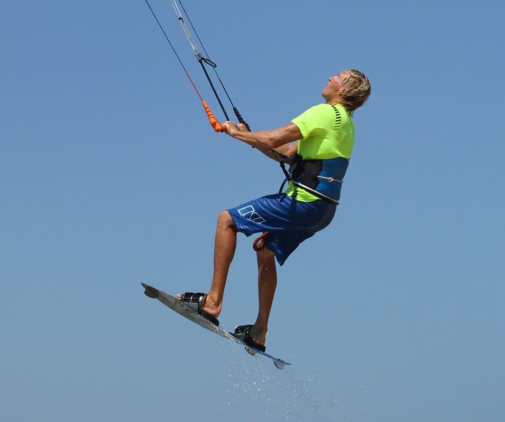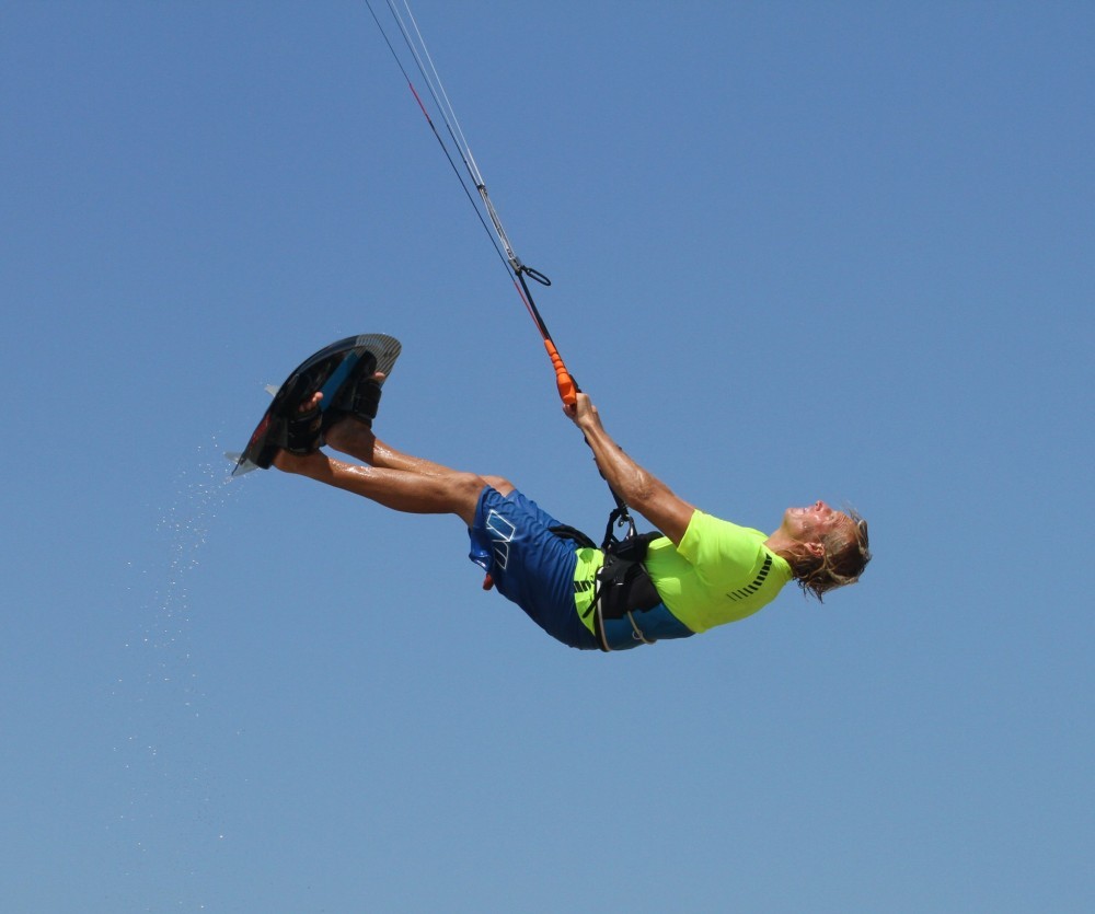 As you will be supporting yourself on the bar it’s a good idea to trim your sweet spot in towards you if you’re used to riding with it at arms length. The reason being that if your sweet spot is a long way out, when you pull on the bar you will stall your kite, and as a result you will accelerate downwind whilst you’re airborne, and generally speaking this is off putting, especially when you’re in the process of going upside down.
