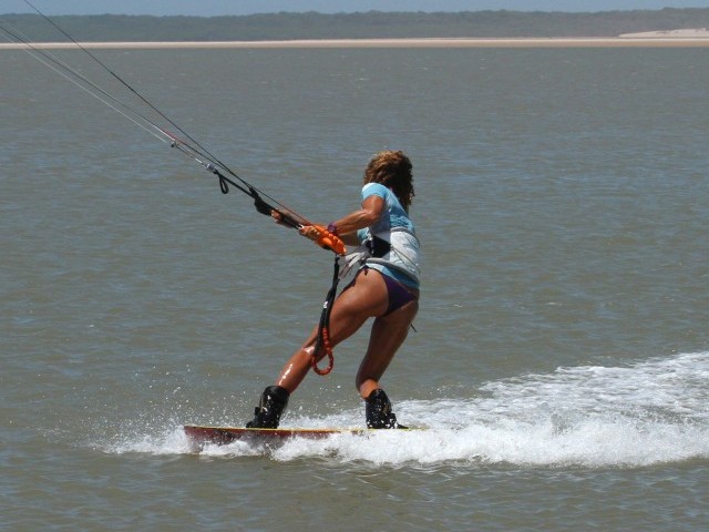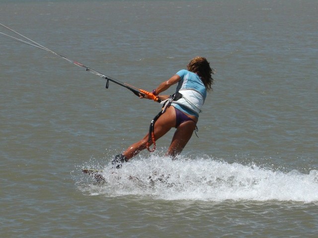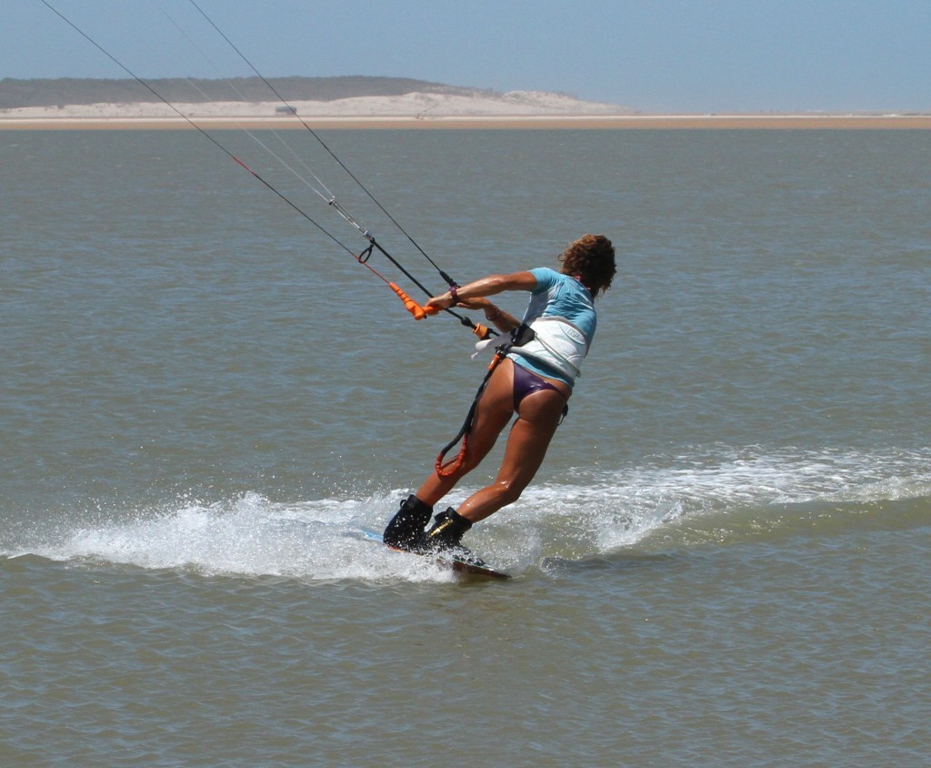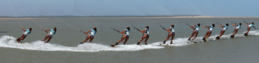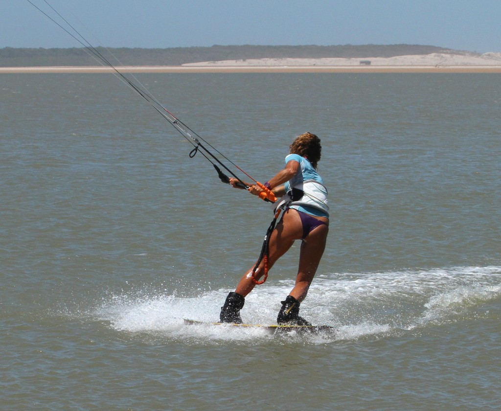 If you’ve done all the aforementioned, this will be your reward. Your body will be ready to carve, with your hips back and your knees driving to the inside of the turn. The kite has come under low and is pulling Karine nicely back from whence she came and as such, she’ll motor off on her toes. Note though how she still has the bar in on the sweet spot and she’s still pull pushing the bar. Don’t be tempted to finish the underturn too early. Rather let the kite rise and dive it back down, than have it skimming the water and crashing. Now all that is left is to get comfortable on your toe side and then untwist the bar, but yet again there is no rush.