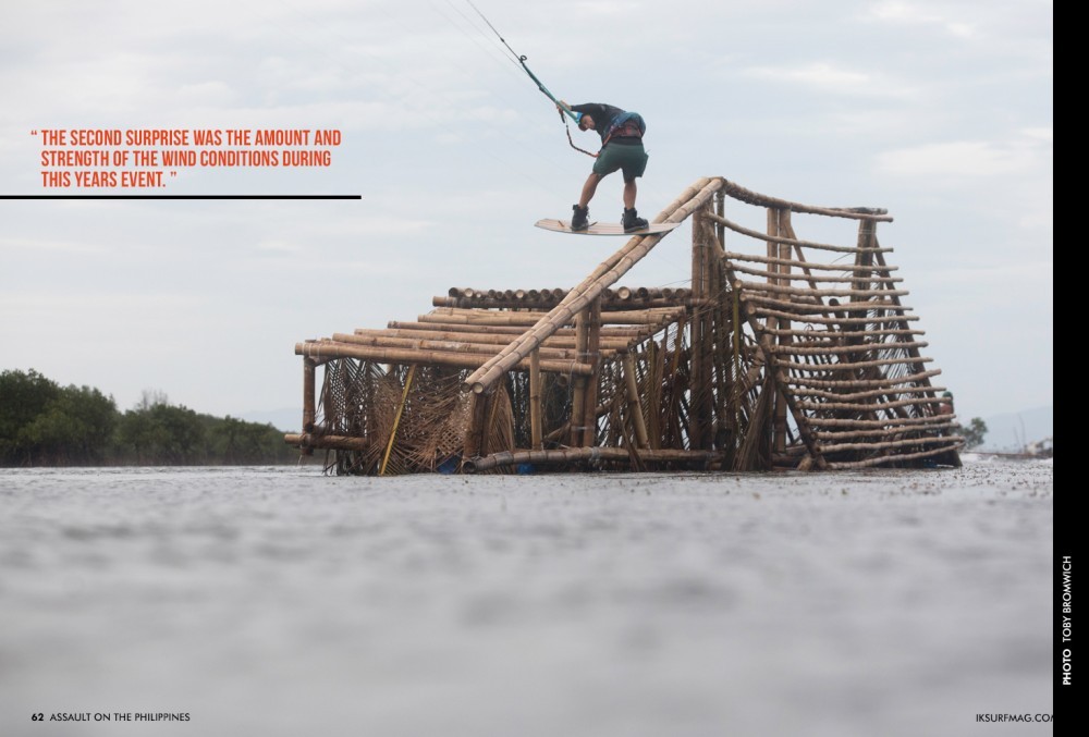 The feature, although well built, was riddled with gaps and holes. Imagine a cheese grater ready to take you down bit by bit. However, once the riders had kites in their hands their reservations immediately vanished. The rail was a riot to ride and held up well in the wind and for the riding. It was unbelievable to see the potential that bamboo has for a building material. We usually only see it used to make single barrel rails, mostly up rails. To see such a significant structure made entirely of the material was really impressive and many kudos were given to Eric.