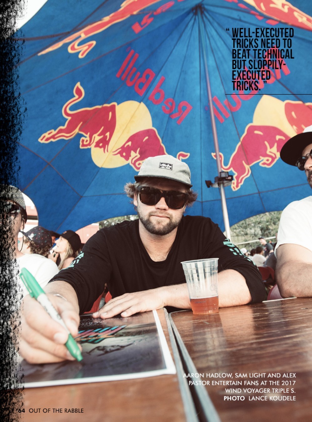 At the 2015 Hood Jam, each rider was able to make up his or her mind about the scoring. Since then, the KPL has moved on to hire knowledgeable judges, including KPL head judge Alexander Lewis-Hughes. Depending on the event, joining Lewis-Hughes on the judging panel are former competitors, wakeboarding judges or, as was the case with Peair Legov at the 2017 Spornado Hood Jam, a current rider who is on the sideline due to injury.