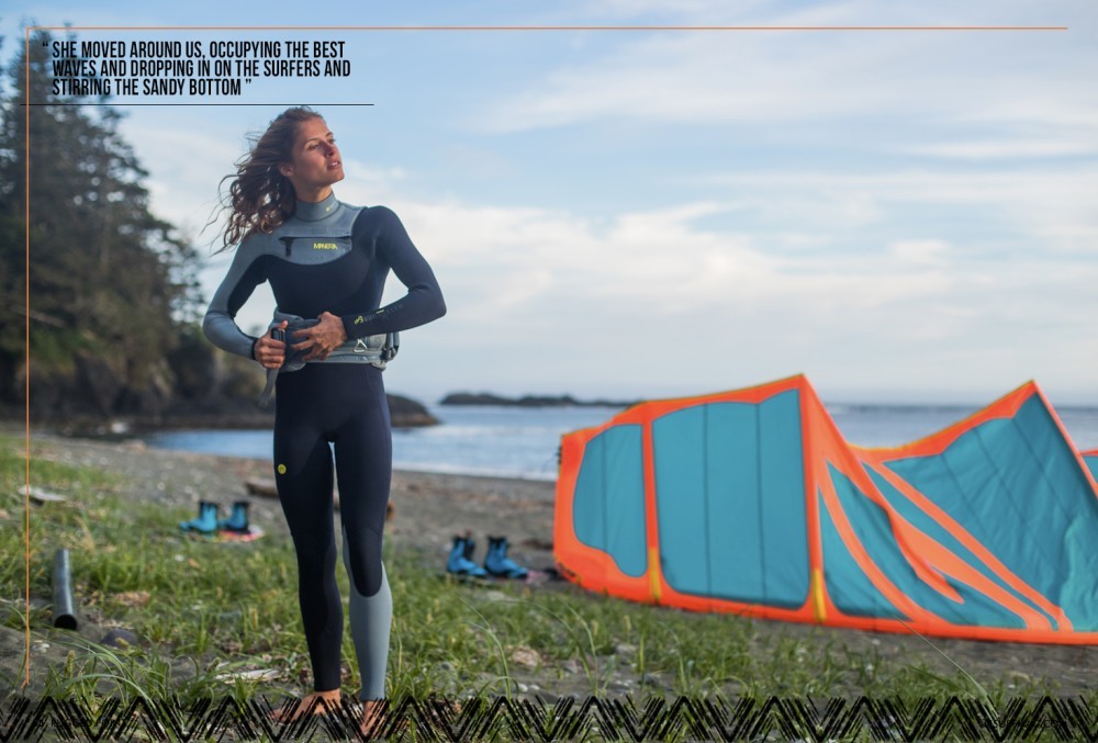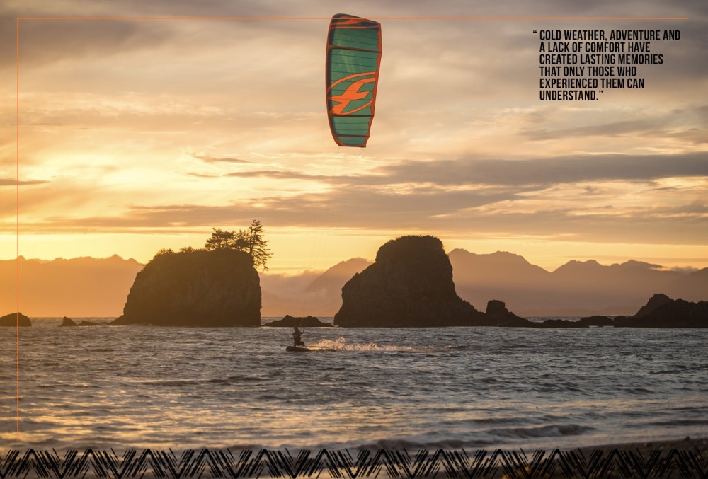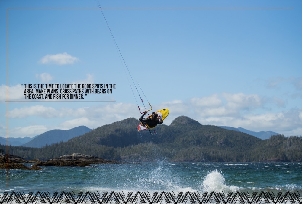 Five short minutes later, we are all in the water, at the peak, ready to surf our first waves in British Columbia. The water is translucent blue, and the waves roll right along a rocky cliff. We remain in the water a few hours, then a few gusts of wind begin to come in, announcing the start of our first kite session.