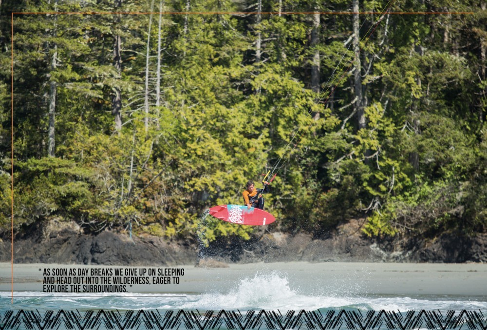 Islands and reefs form a barrier around the bay, high enough to protect it from the chop, but low enough not to break the wind. It seems very promising! The spot is beautiful. The beach and the islands are lined with huge pine trees. As the sun sets we see the Brooks Peninsula in the distance, all we need now is the wind!