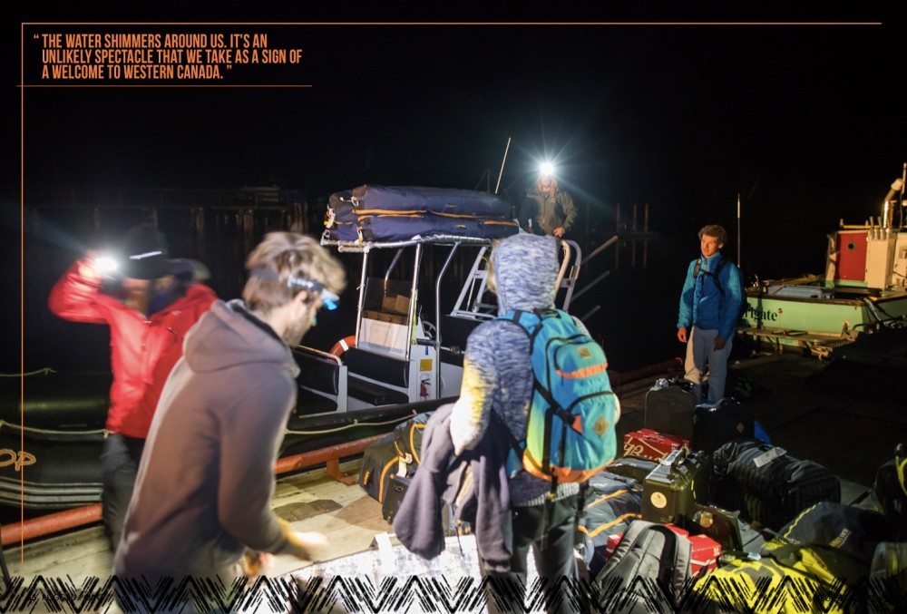 It's a dark night; we have been travelling for several hours on a dirt road filled with holes, we are exhausted when the brakes on the van screech and we finally stop. Around us stand colossal fir trees. We are in a small clearing at the end of a fjord. There's an old wooden dock where we see a rigged-hull inflatable boat. Two bearded Canadians take out their flashlights, and they dazzle us. These are our guides; Bobby and Phil.