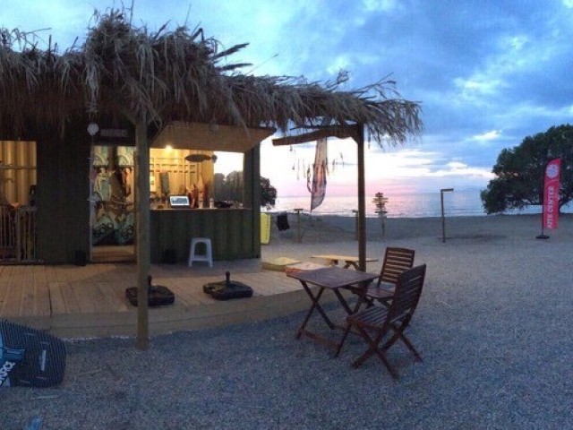 Theologos beach is the best place to ride and learn about the island. The huge coastline, not crowded, not a lot of other users besides kiters. Clear warm water, quite flat at the beginning of the day when the wind is lighter and later on the day small waves close to the beach, and it gets a little choppy.