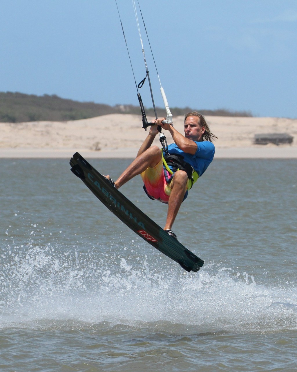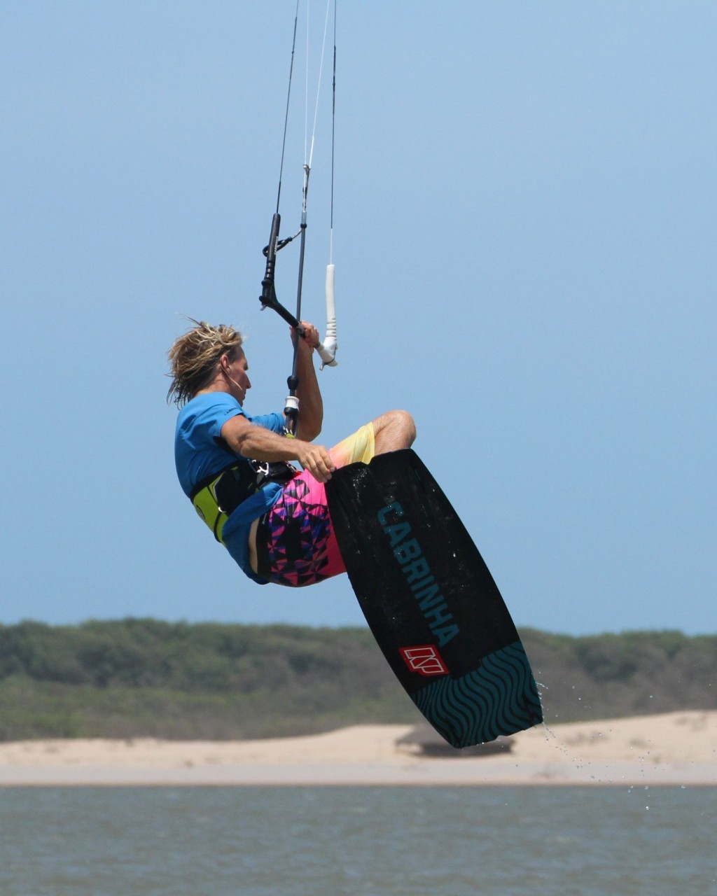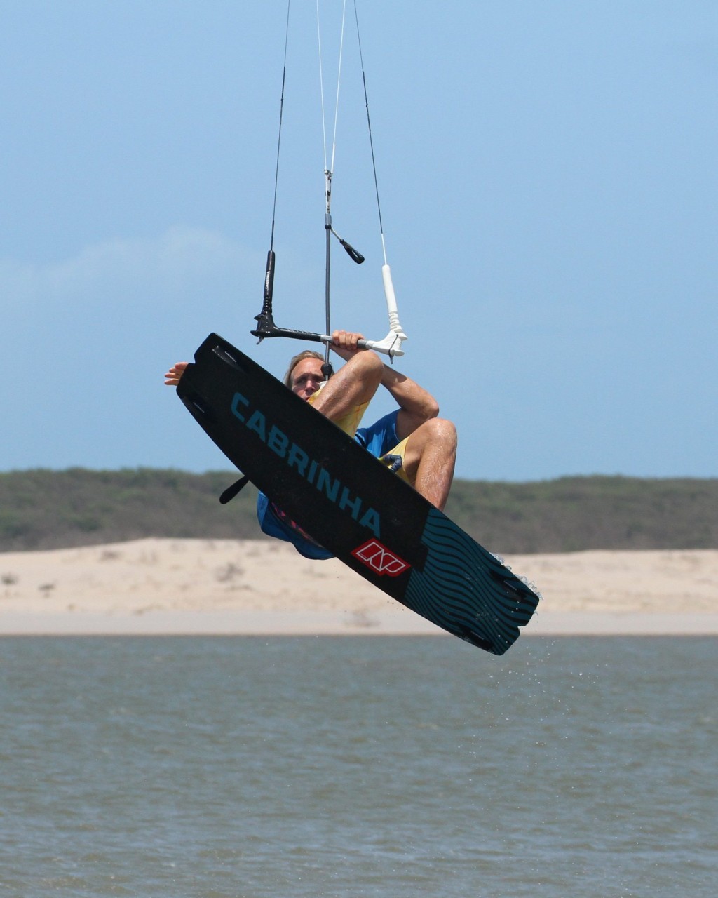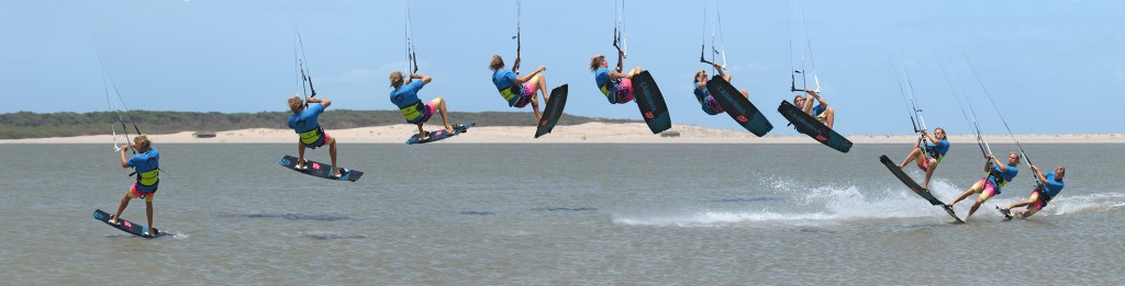 The rest of the rotation should be simple enough once you’re up as long as you can keep control of the kite. Your aim is to rotate slowly so that you have time for the grab. With the kite keen to go back, you need to be aware of where it is at all times. Even though it’ll help pull you back and start your rotation, if it carries on back it’ll just dump you down again. Your next goal is to get your knees up. This will only be possible if you keep the bar in on the sweet spot. As you lift the knees the board will come up nearer to you and into a position that you can grab it. If you look at Christian his bar is in, he’s steering the kite forward slightly, he’s looking where he wants to grab, and his knees are lifted.