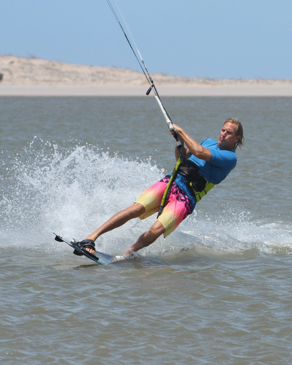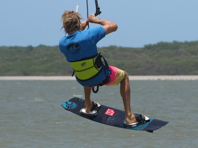 As you take off, the kite will pull you slightly back as it lifts you. As you feel it pull, you must stamp down against your edge, digging the tail in as this will encourage more up and less back. You can see in the pic that Christian’s shoulders and his head are leaning back. As long as you go up you’ll have time to rotate. Once you do start to go up it is super important to stop the kite going any further back in the window. As a result of being toeside, and thus it potentially being a weaker edge your kite will likely fly further back than you’d like, so stop it on take-off by levelling the bar as Christian has here.