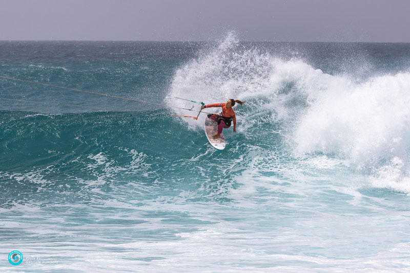 JC’s been training hard over the winter in Indo and at home in Tarifa and was linking committed, carving turns, and she had the better wave selection at some points in the heat. However, Correia’s surging bottom turns and snaps off the lip were hard to deal with, and she won the heat and was on her way to meet Moona in the final.