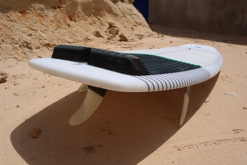 It is built using Futurelite construction which marries a traditional surfboard construction process with high-end materials. The “tech bit” is a carbon fibre and Innegra wireframe reinforcement that runs about an inch inside the rails around the tail of the board to about a foot from the nose. This reinforcement is inserted into channels and runs through the fin boxes too.