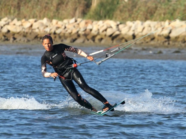 The final ingredient, onto your toes. We mentioned above about finishing your turn. The finish line is when you are on your toe side edge riding back up wind. There are a couple of things you’ll need to do to get there. First off is to let the kite breath. Chances are that with your two hands steering the bar around the downloop onto your toeside you may have pulled it in slightly. So even if the kite is not fulling stalling, you are probably strangling it a bit. Let the bar our gently so that the kite can breath. Now it will fly to the edge of the window and can pull you upwind. Secondly you need to get onto an edge. Letting the kite breath will help, but you’ll also need to get your weight forwards to get more board in the water. Do this by keeping your chest open, flexing your front ankle and knee more and moving your hips forwards towards your front foot. You can see that Karine is moving her weight forwards, and yet again she is looking where she would like to go, which is upwind.