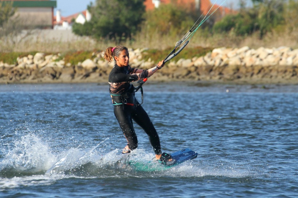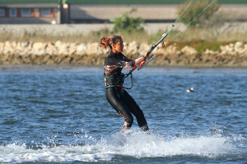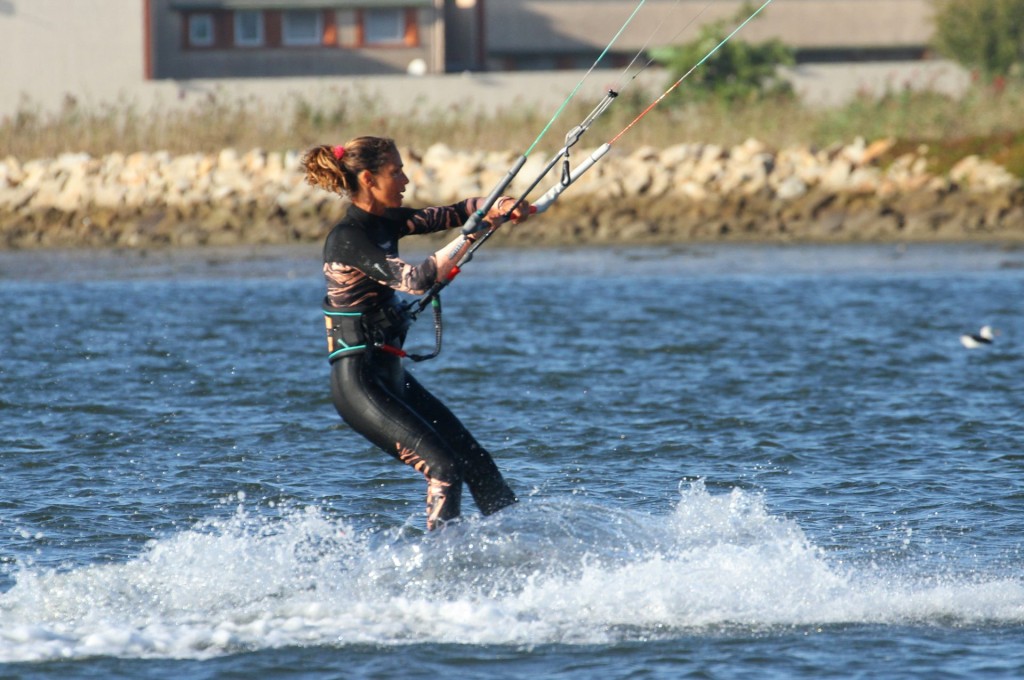 This is the moment you’ve been waiting for. As the kite starts to fly across the window, even momentarily in a little loop it will start to pull. What’s beautiful is that the pull starts one side and moves across the window, actually helping you around your turn as it moves across. However as there will be some power you must direct that energy down into the board to drive yourself further around and resist the temptation to follow the kite and therefore lose tension, power and speed. It’s also possible that the kite will start to climb again, and if this is the case you need to stop push/pulling, level the bar and steer the kite so that it flies forwards in the new intended direction. Karine has dropped her weight more against the power in the kite, she’s levelled her bar and is focusing on finishing her turn so that she ends up toe side going back from whence she came. If you feel overpowered during the carve you can ease the bar out a bit.