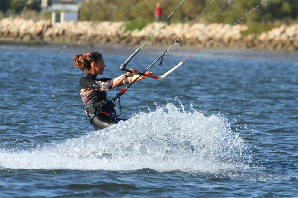 Once the board is flat and you’re over it, it’s time to pull the trigger and start the loop. By flattening the board you will have started to steer it off the wind. As such you’ll slowly be loosing tension in the lines and speed, so you can’t wait too long. This bit is all about commitment. The more determined you are, the easier it will be and the kite will produce less power. To get the kite moving in the smallest possible arc you must use both hands, pulling down on your front hand whilst pushing away on your back hand. This will bring the kite down and then through the window in a C shape to the left. Or if you’re doing this to the right it’ll be more of a Ɔ. The joy of using two hands is that you can keep the kite on the sweet spot, the result being that it will turn fast and you won’t stall it. Don’t stare at the kite as you need continue your own arc. Karine gives her bar a hefty pull/push, touching the knuckles on her back hand against the centreline. She’s looking forwards, downwind which is where she intends to go next.
