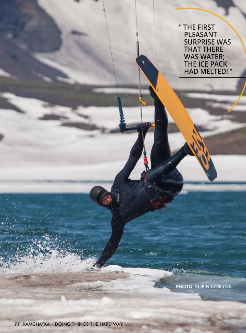 The next day, we loaded the Soviet vehicle and left for 6-hours of very rough terrain, moving in all directions, and that clearly did not help our hangovers. After driving for a bit on the snow, we arrived above the crater. The first pleasant surprise was that there was water; the ice pack had melted! The second pleasant surprise: it was blowing a consistent 15 knots!