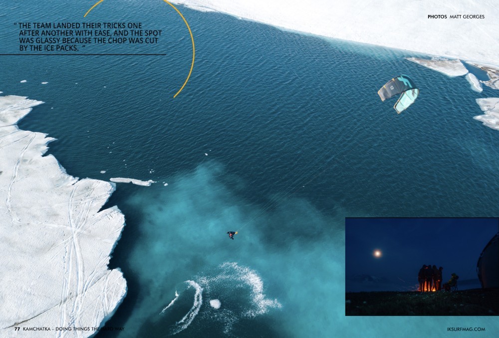 Paul and Max got out the gear and ran to the water, carving down the long snowy slope to the lake. The filming crew slid down as far as they could. The sun was low, and the light was perfect, the team landed their tricks one after another with ease, and the spot was glassy because the chop was cut by the ice packs. They picked up speed on the snowy slope to send their biggest tricks, they slid on the icebergs, the scene was unreal, and the ambience was festive that evening! It was still too early to drink another beer, but we shared a good meal around the fire, and it was pure happiness.