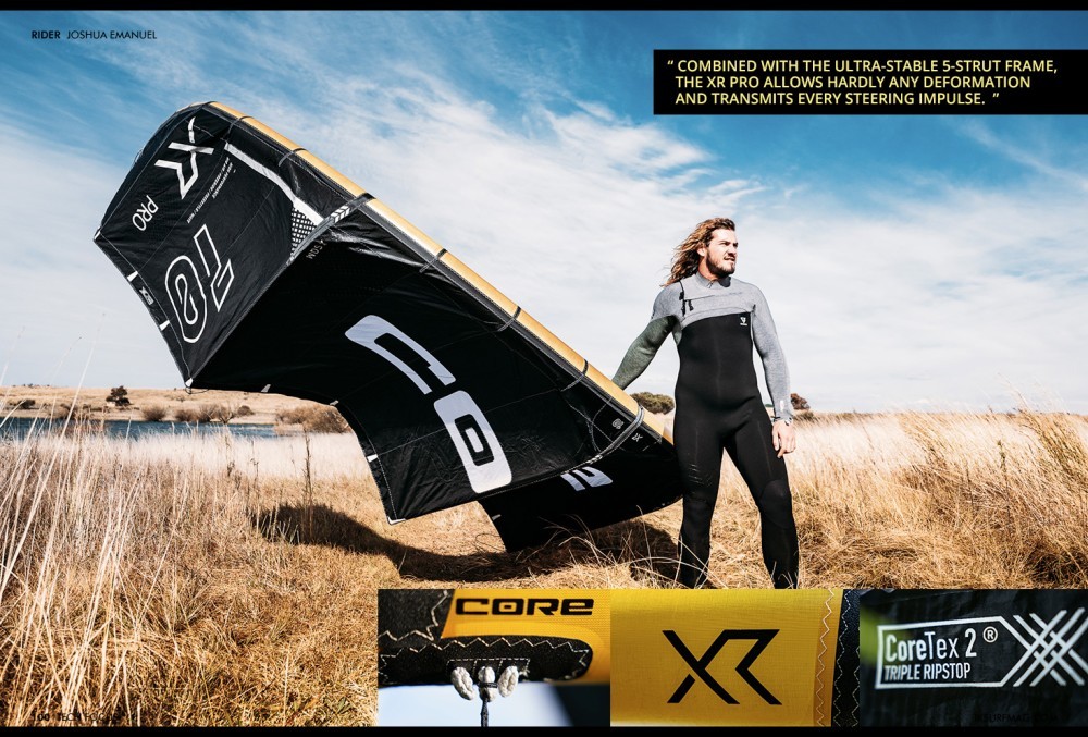 We have been experimenting with new and hyped materials like Aluula for quite some time. But for a long time, we didn't really see an added value compared to our own proven and high-performing materials like ExoTex 2. The idea of a competition XR changed the perspective. Angely, Zara, and Josh have been using previous versions of the XR Pro during competitions like King of the Air, Lords of Tram, and the GKA Big Air event in Tarifa, and always brought new insights to the R&D team. We added it to CORE's Pro range, which already includes the Sensor Pro since 2013 and later expanded to include the Halo Pro wing and, now, the XR Pro. All of the products in the Pro range share a common feature, the use of highly sophisticated materials, which completes the entire concept.