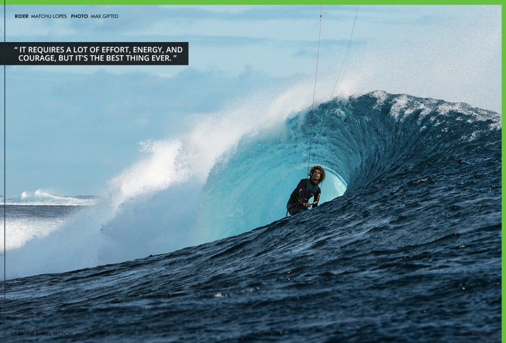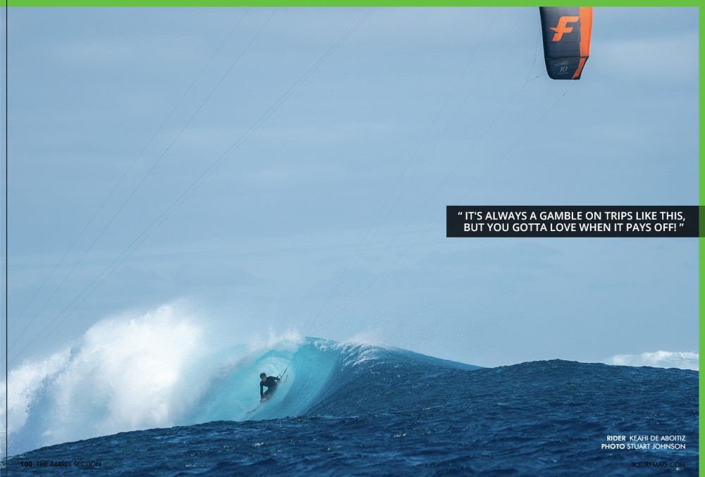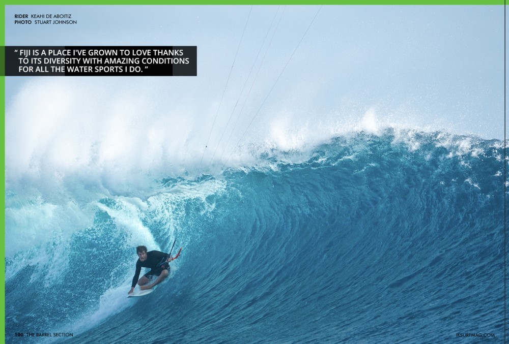 The absolute enthusiasm when Matchu speaks about riding barrels is hard to translate to the page, but we hope you can feel it when you read his words! Speaking of Fiji, Keahi de Aboitiz, who appears on the cover of this issue, scored that barrel shot in Fiji. While he's no stranger to riding barrels (Tunnel Vision, anyone?), this was his first time under the lip on his new kit. Keahi tells us about his trip to Fiji and what it took to get the shot!
