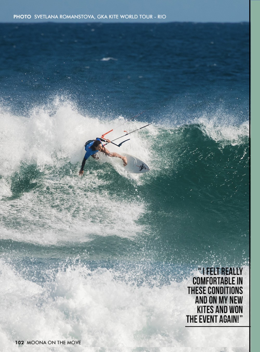 The Cabo Verde event marked the end of a 10-year partnership with Cabrinha and was the last one on my current gear. In June, I officially joined the F-ONE international team. Our first photoshoot in Fiji allowed me to work on my backhand kiting, preparing for the Rio competition, the second stop of the tour. I had always wanted to go to Brazil before and decided to give the tour one more try. Many people asked how it was to switch gear after so many years with one brand, but I found it to be an easy transition, as I genuinely liked the new equipment. I had a lot of confidence in my riding, which made me want to show the world how well it performed.