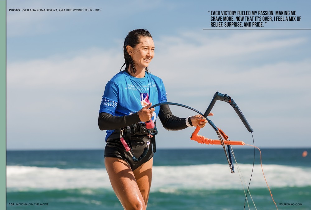 When I got out of the water, I heard the beach announcer say, "Moona Whyte, World Champion!". I knew there must be a mistake! But, sure enough, Nia had not landed her jumps, and I had won the heat. The relief of that heat and the confidence boost it gave me kept me relaxed enough during the final against Bowien to take the win once again! It didn't feel real, and I was still mentally focused on kiting, so as soon as I could, I went out on my kite again.