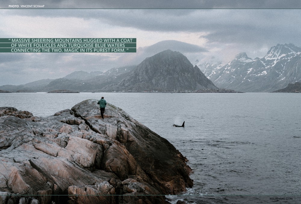 The view upon arrival was breathtaking, and just cinematic, really. A panorama of mountains, ridges, fishing villages, and dramatic clouds. An ever-changing play of light and shadow. Ozzy described it: "Massive sheering mountains hugged with a coat of white follicles and turquoise blue waters connecting the two. Magic in its purest form." Underway, we spotted fins, which later revealed themselves as a family of orcas, an unreal moment.