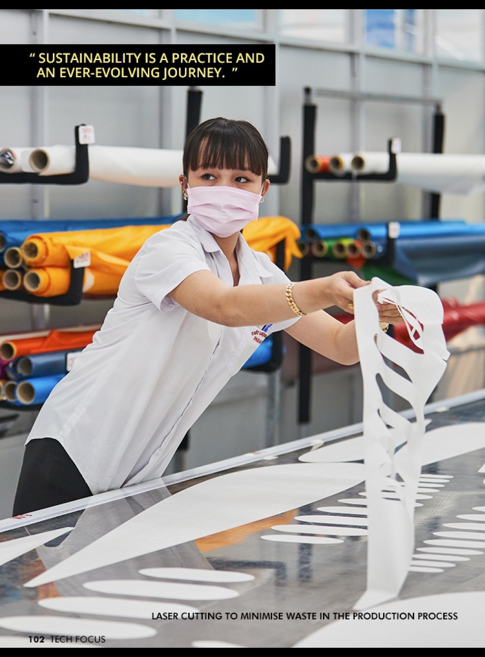 Sustainability is a huge priority for Ozone, and it's always been evident, but not just in the most obviously publicised ways used in marketing. Sustainability is a practice and an ever-evolving journey. It runs through everything we do, from the solar panels on the roofs of all nine of our factory units to the custom-built CNC machines and nesting programme that ensures we cut each piece of material with minimum waste. Our clutchless sewing machines also use less power, and we use material offcuts to make bags, straps or panels for harnesses, for example.