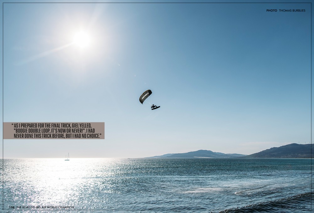 With no spare board left, I borrowed one from Giel. The straps were too big, but there was no time to adjust them. I had one last attempt. As I prepared for the final trick, Giel yelled, "Boogie double loop, it's now or never!". I had never done this trick before, but I had no choice. With adrenaline pumping, I went for it. Somehow, I landed it perfectly. The whole beach erupted in cheers. Overwhelmed with emotion, I started crying, realising that I might have just become World Champion.