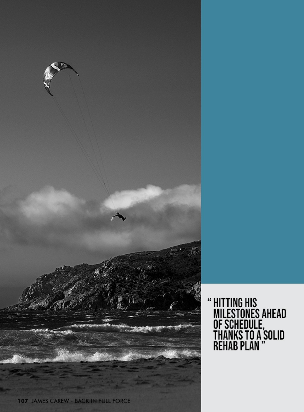 While the mental side of recovery was challenging, James found peace in the ocean—even though he couldn’t surf or kite. “Not being able to surf was harder than not kiting,” he says. He started swimming in small waves early on, “The first day I swam in a one-foot wave, I felt like a kid again.”