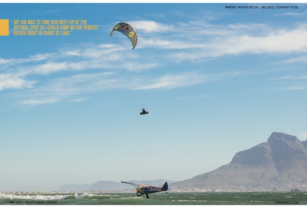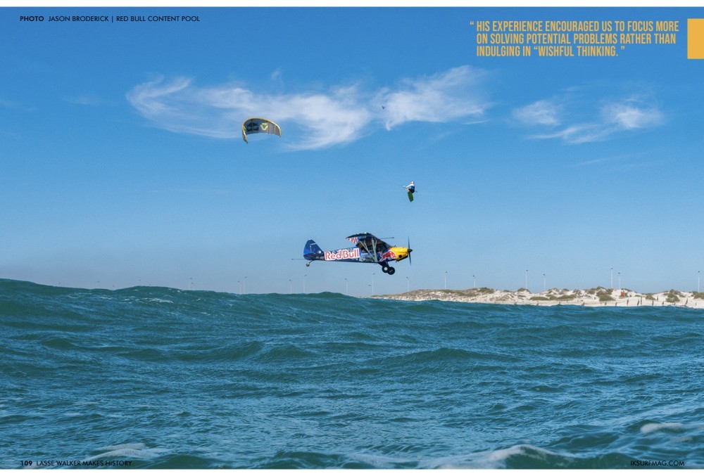 Once Luke was in the air, he could see exactly where the sets of waves were forming. Luke is an incredibly skilled pilot, and even in those challenging conditions, he was able to update me about the waves lining up ahead of him. From that point, my job was to time our meet-up at the optimal spot so I could jump on the perfect kicker right in front of Luke and leap directly over the cockpit.