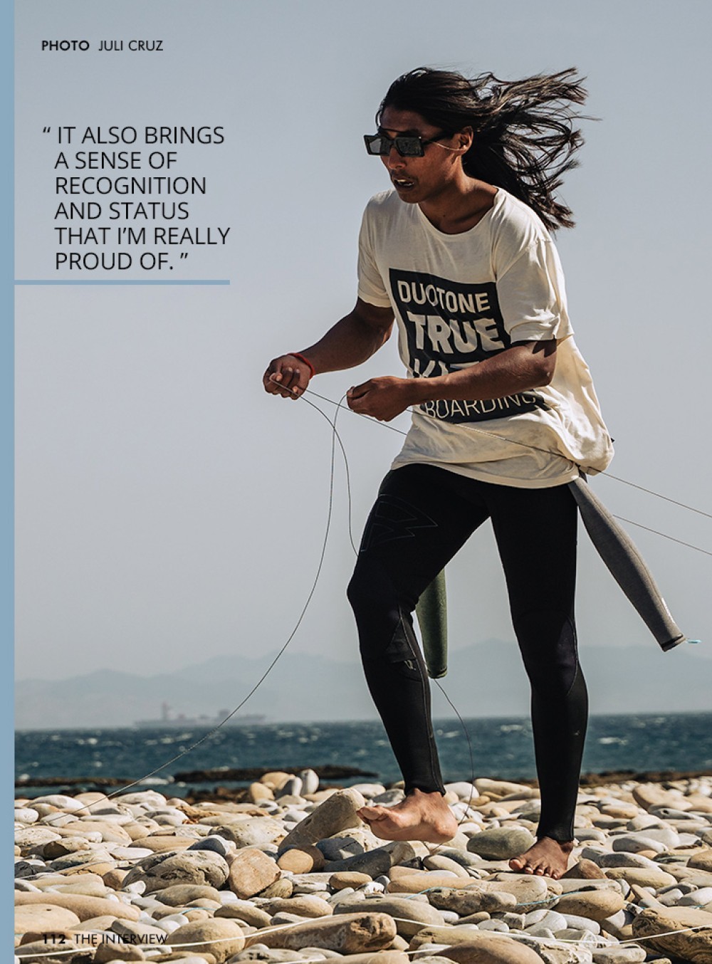 I first saw a kite when I was seven. Back then, before kitesurfing arrived in our town, the tribe was not allowed to interact much with the outside world. There was a fear of change and a concern about losing our culture. Initially, kitesurfing was not accepted. Three years later, someone returned with a different mindset and fresh ideas for the people in Cabo. His name was Martin Vega. He was the first person to introduce kiting to us. My brother, a friend, and another guy were the first to learn the sport. After that, my brother tried to teach me kite control, but never let your brother teach you anything. It was a crazy experience. Eventually, someone else stepped in to help me, the Rasta man. Still, it took me a long time to get on the board. I was afraid of being dragged out into the ocean and not coming back. But it was all worth it. There were big challenges, but here we are, flying the flag as high as possible.