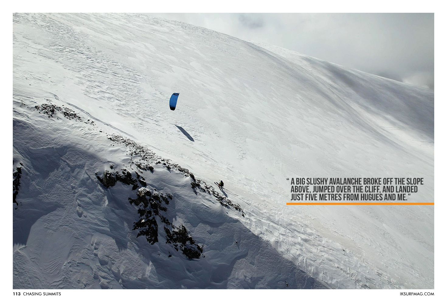 A few minutes after that, a big slushy avalanche broke off the slope above, jumped over the cliff, and landed just five metres from Hugues and me. That day, I felt more than ever that the mountain was not my place at that time. The outcome was my worst experience in the mountains, topped off with a ten-kilometre walk back.