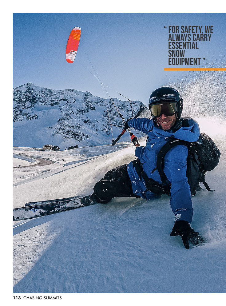 For performance, we use freeride or touring skis with skins, along with a kite made from light material to optimise in light wind. A reliable safety system is essential, such as Ozone’s internal re-ride system, which is perfect for these conditions.