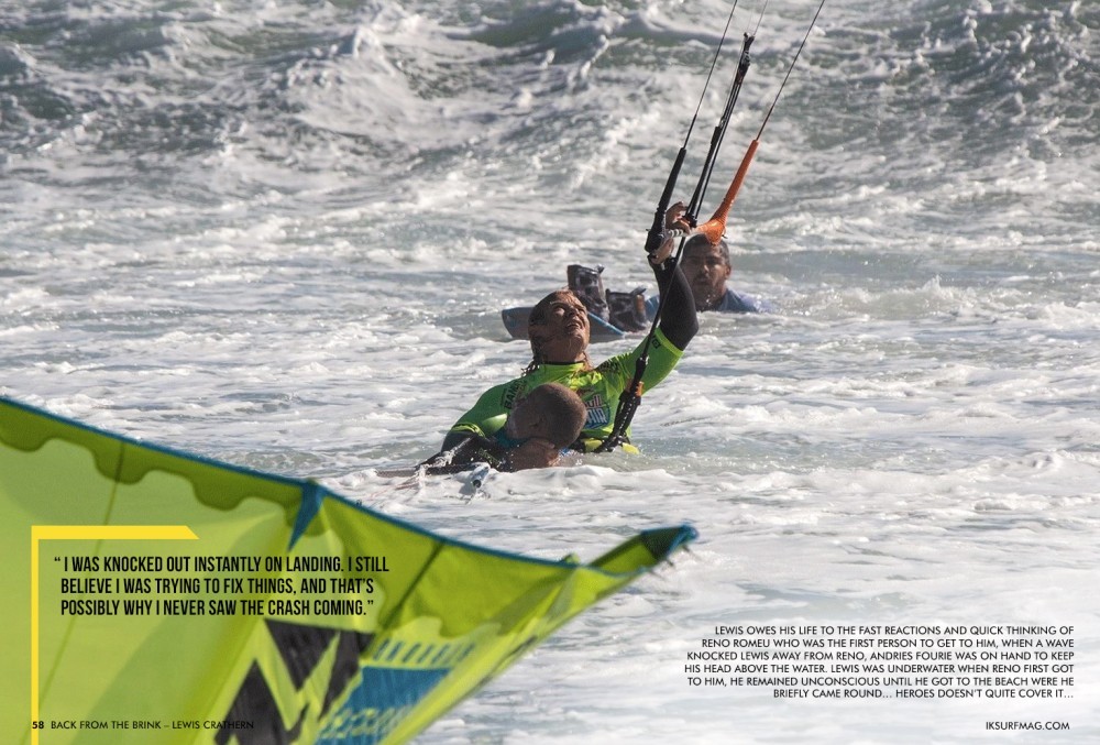 As far as I am aware, Reno got to me first. He mentioned to me that he just saw lines coming out of the water, and I had ended up beneath the surface. He then got underneath me and pushed me up and out of the water. Waves came in, and we got separated, then, Andries managed to grab me and keep my head out of the water. One other element that was in my favour is that my kite was pulling me still towards the shore.