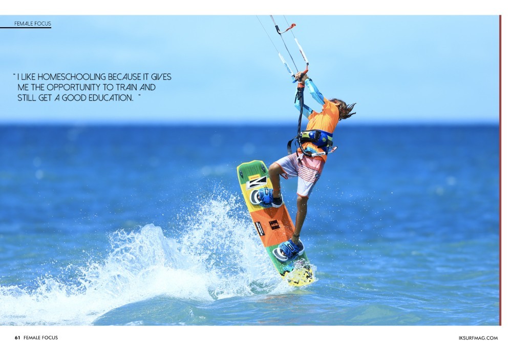 I am homeschooled so I have the privilege of arranging my school day around the wind and my kitesurfing. I go to school for about four hours each day with my teacher. Then, of course, I have homework and independent work, too. When I take a day off from kiting, I usually have a full day of school. I even do schoolwork on weekends and holidays. I don’t really follow a typical school year. When I travel or compete, sometimes I get a little break. I like homeschoolingbecause it gives me the opportunity to train and still get a good education.