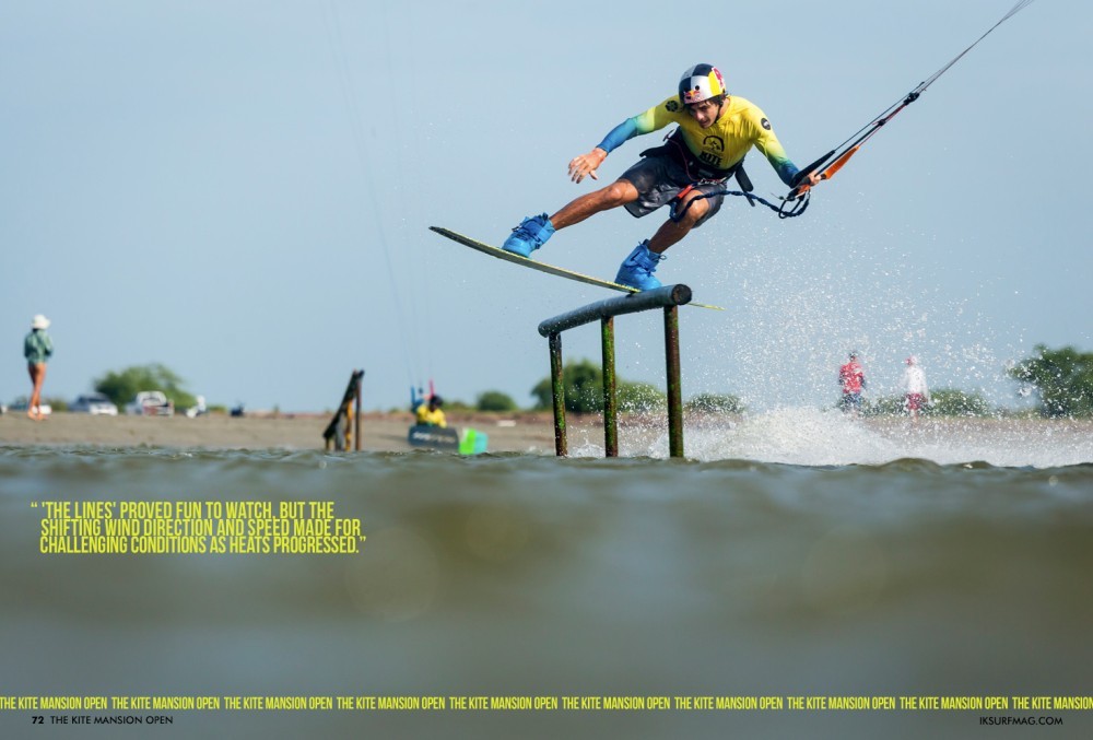 On the right-foot-forward line, we had a short, double barrel hand-rail incline and the flat bar, a single-barrel steel tube that was feet out of the water. Left-foot-forward we had “Cop City”; a massive incline and the flat bar rail. We also hit the kicker on both the left-foot and right-foot setups. Each feature was scored out of ten points and for the 'The Lines’; an additional five points were automatically added for flow. Flow points could only be deducted based on mishaps, while in between the rails on each line. These mishaps were: grabbing your chicken loop, bad kite control, switching your stance or your leash or anything that messed up the flow.