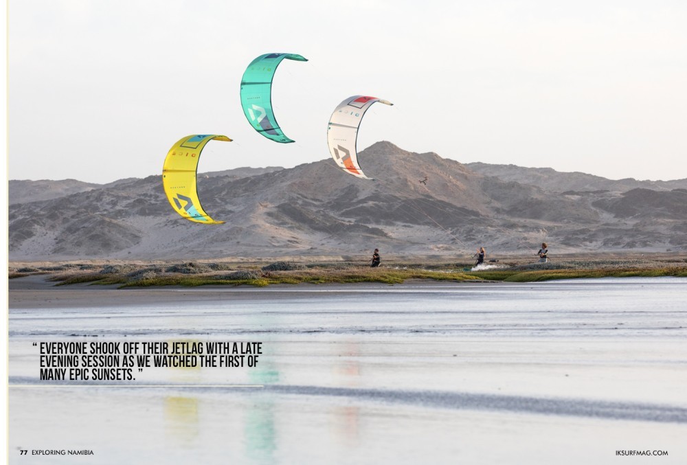 Settling in for what was to become the shortest journey of our two-week trip we were already unloading at our base camp at the Lagoon Chalet only minutes later. We quickly assembled our boards and unpacked our kites, loading up just enough gear to catch the tail end of the day's wind at the local spot right in Walvis Bay. A large flatwater tidal lagoon borders the edge of town offering up easy access to side onshore conditions, prime for freestyle. Everyone shook off their jetlag with a late evening session as we watched the first of many epic sunsets.