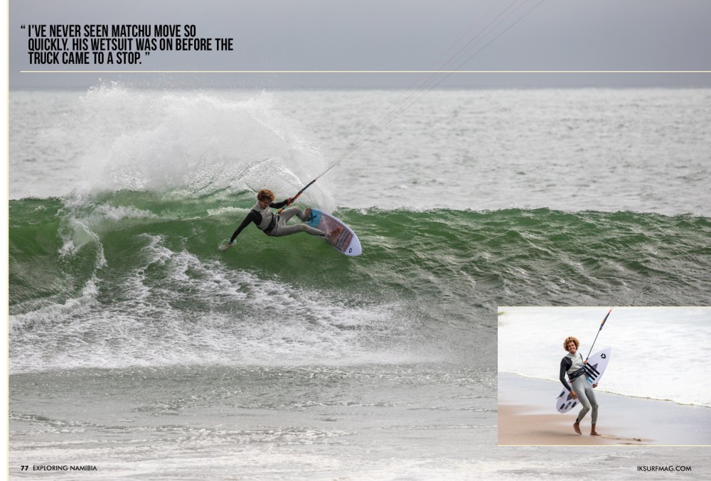 We arrived at the surf spot and knew it was on because we could hear it even before we could see it; fast, hallow, clean. It was breaking, and the wind was blowing. I've never seen Matchu move so quickly. His wetsuit was on before the truck came to a stop. He bounded out, scrambling to the roof where we kept the gear — kites, bars, harness, flying past the windows down to the sand below. Matchu wouldn't come off the water, lining up sets and dancing along their faces. He didn't have to say it; I could see it written all over his face that this was an epic day for the rider who has travelled the world looking for incredible breaks. The rest of us couldn't help ourselves either; we had to get in the water. Reno even paddling into a few and tucking into the fast-moving barreling wave. It was hands down the ideal finish to what was arguably one of the best team trips we had ever been on.