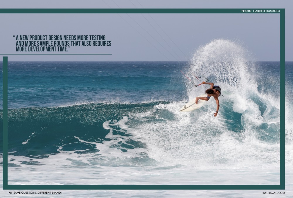 In general, all our products are heavily tested in different conditions and locations around the world. Sample production and related testing is fun, but a time-consuming part for our development team. Each kite size or board model is tested and refined 2 or 3 times. For example, for our kite range, we produce over 70 prototypes yearly.