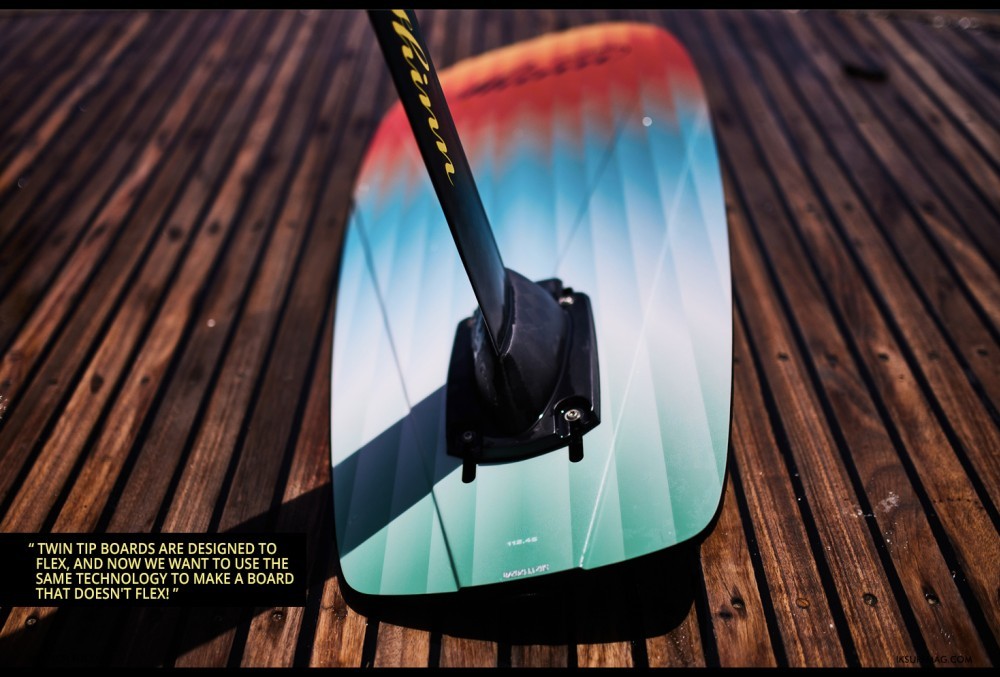 We make products with foam cores too, which generally have a lot more volume. However, we feel that low volume foil boards are simply easier to use. Having decided on this direction, it made sense to use wood core and ABS sidewall technology. There is a big sticking point, though; Twin tip boards are designed to flex, and now we want to use the same technology to make a board that doesn't flex!