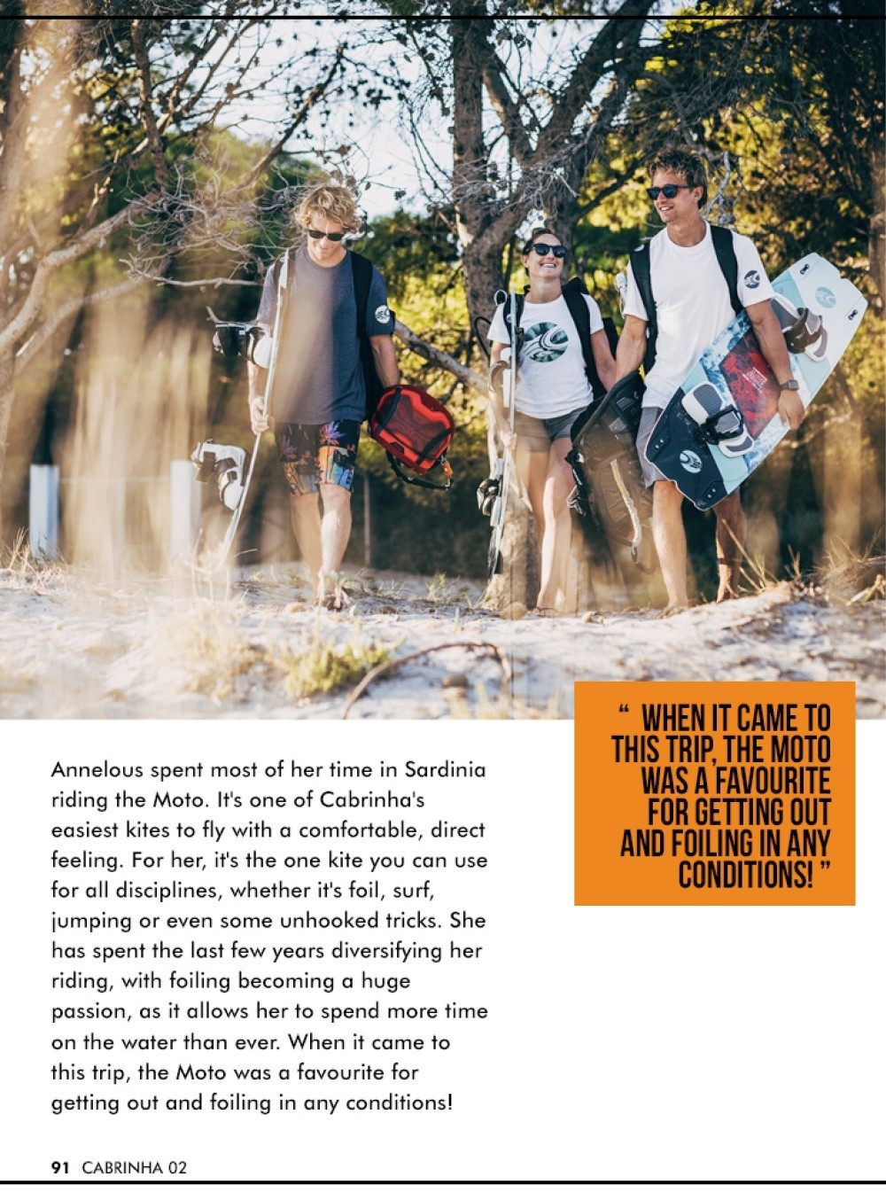Annelous spent most of her time in Sardinia riding the Moto. It's one of Cabrinha's easiest kites to fly with a comfortable, direct feeling. For her, it's the one kite you can use for all disciplines, whether it's foil, surf, jumping or even some unhooked tricks. She has spent the last few years diversifying her riding, with foiling becoming a huge passion, as it allows her to spend more time on the water than ever. When it came to this trip, the Moto was a favourite for getting out and foiling in any conditions!