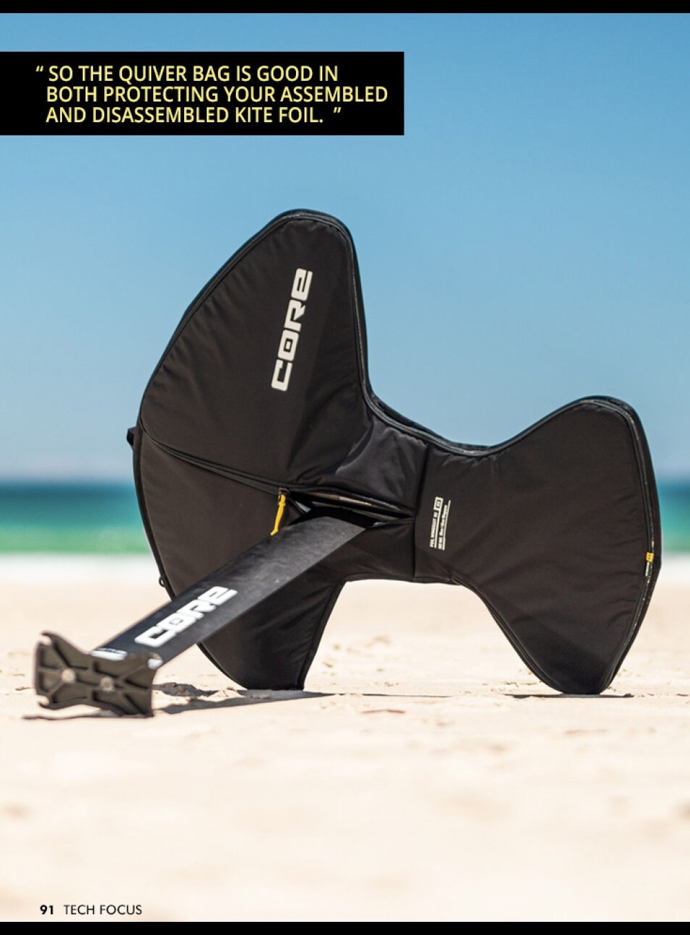 The Quiver Bag 140 is quite unique in its idea and function. With two separate compartments, one for a kite foil board and the other for the foil components, you have one convenient, perfectly padded bag for a complete kite foil set. In the foil compartment, you have velcro patches for attaching the optional CORE Foil Covers to protect each kite foil component. In the mast pocket, you have the option to store your mast even with a mounted base without damaging the board. A long velcro opening at the tail of the board compartment allows keeping the mast and foil assembled mast. So the Quiver bag is good in both protecting your assembled and disassembled kite foil. It's big enough for all CORE Kite Foil components and boards up to ca. 140 x 51cm / 4'7" x 20".
