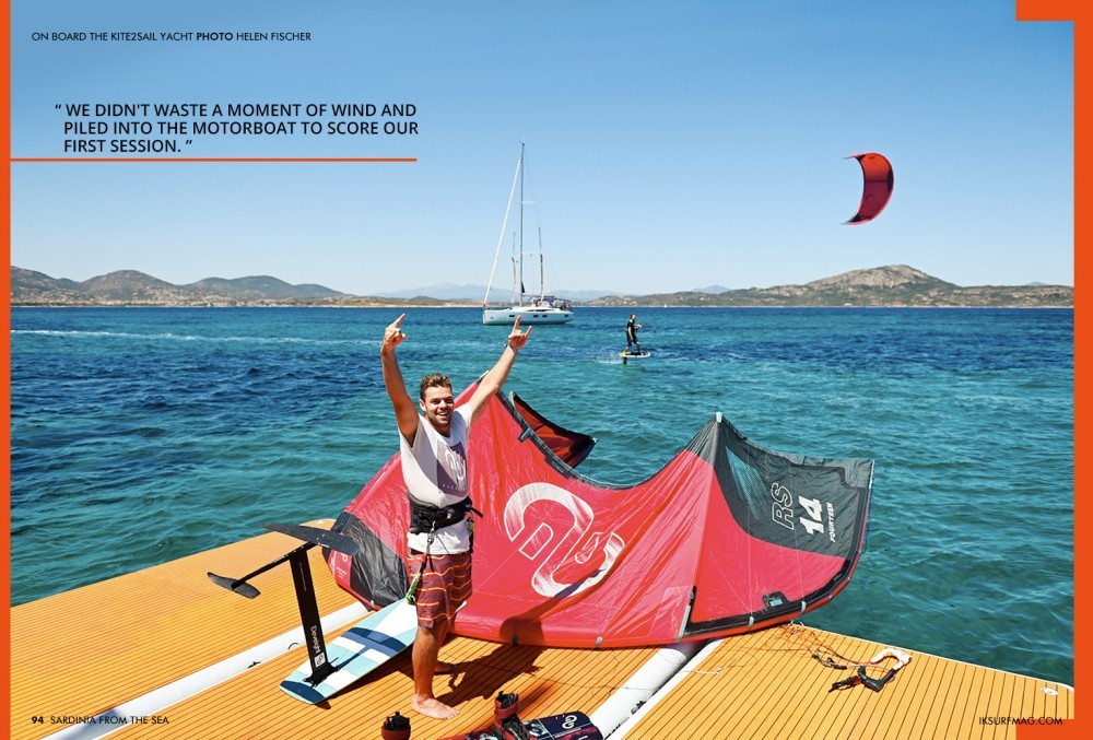 Day Two brought a light breeze that cooled down the hot air in the Marina Dell'Isola, the base harbour of Kite2Sail and the starting point of our yacht trip. We didn't waste a moment of wind and piled into the motorboat to score our first session. With 6 to 9 knot winds, we launched the 12m Eleveight RS+ from the boat. Sören got lucky and caught a gust immediately, so he could get on the foil instantly despite using a bar with only 15m lines. Sören Cordes, aka the Content-King, was the other team rider on this shoot. You need to get very lucky to see him without a camera in his hands, mouth or lines, if not all simultaneously.