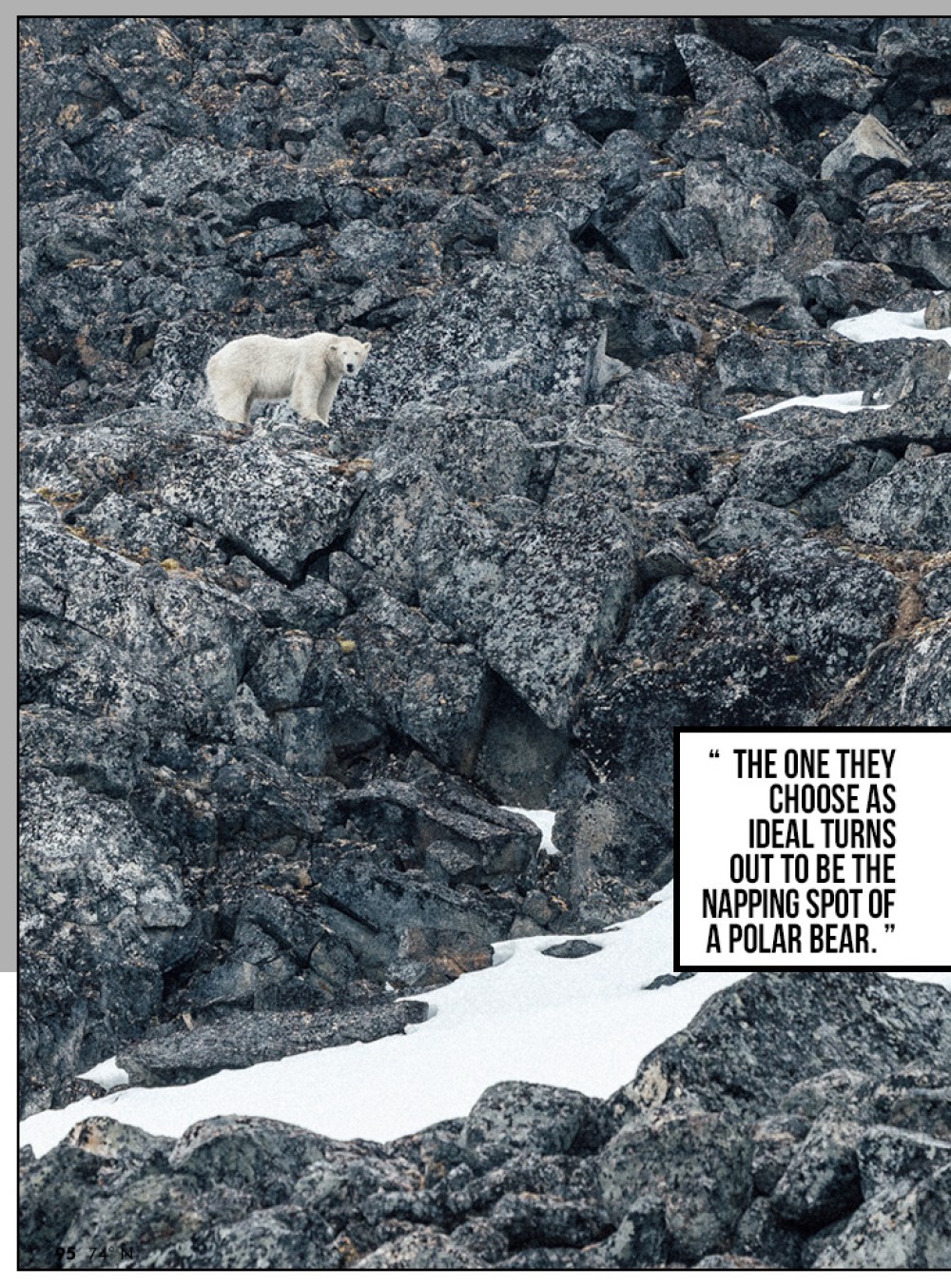 We are now anchored in a fjord that should get wind by the afternoon's end. Matt and Olivier check if there is a beach from which we can easily take off. The one they choose as ideal turns out to be the napping spot of a polar bear. Obviously, we decide to change spots and go for one a bit further away, without any land connection with the previous one.