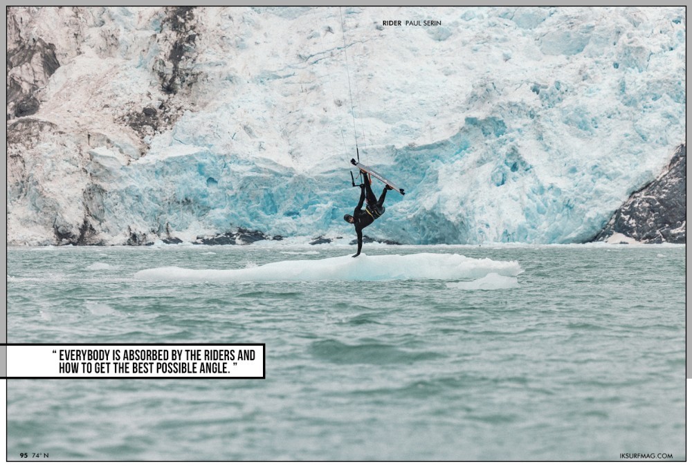 The wind is strange and irregular in strength and direction. It even pauses sometimes. I feel that Olivier and Matt are betting a lot on this session, so I give it my all. The glacier is behind my back. I can't really see it, but they can. Apparently, it's pretty insane. I do the best I can with the wind I have. After 30 minutes, I am frozen to the bone, but more importantly, I feel that the gusts are slowly decreasing in intensity. The end of the session is close.