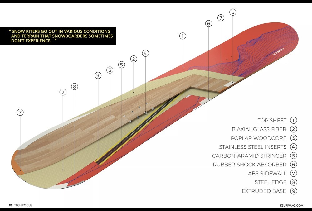 It is much like snowboard construction, using the same machines and the same factory but with a slightly different process. Both boards have Paulownia wood as a core, but the finishing process is slightly different. Kiteboards have PU edges, whereas snowkite boards have metal rails like snowboards.
