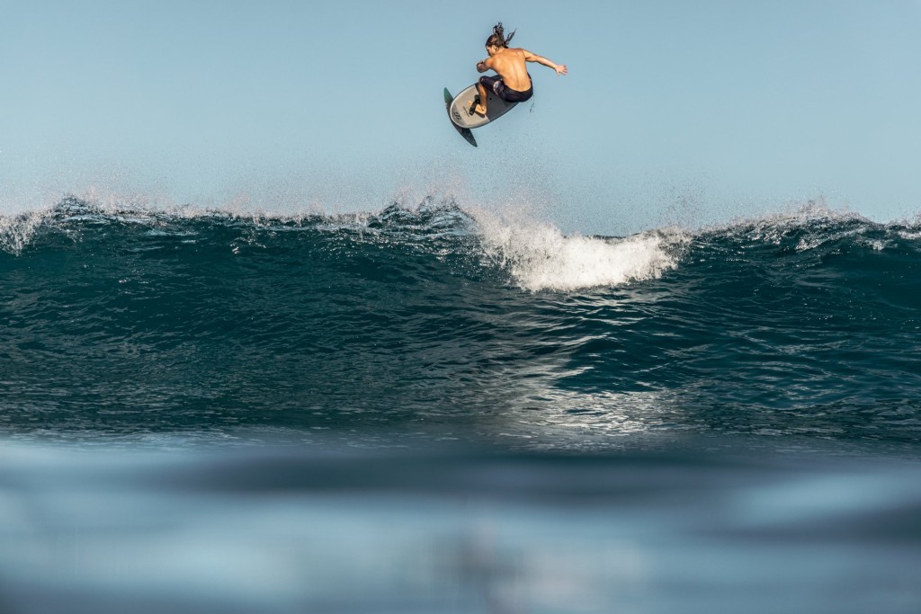 “We’ve put more rocker in the board, which allows you to foil closer to the surface of the water and you can touch down a lot better without tracking. This gives you the ability to push harder through your turns and even attempt to bounce off white washes. Concave in the bevelled rails on the underside of the board improves your grip when duck-diving, and when you’re popping up. We’ve kept the wedge cut in the tail, so you basically don’t feel the drag when you hit the water, just bounce up and carry on.”